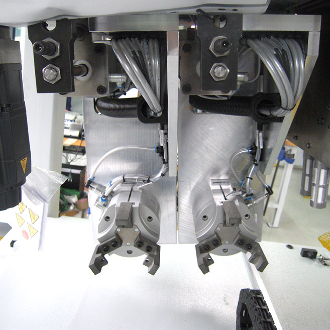 Workpiece changer with double gripper for simultaneous handling of raw and finished parts. At the same time, the alignment of the blanks is adjusted during the changeover process.